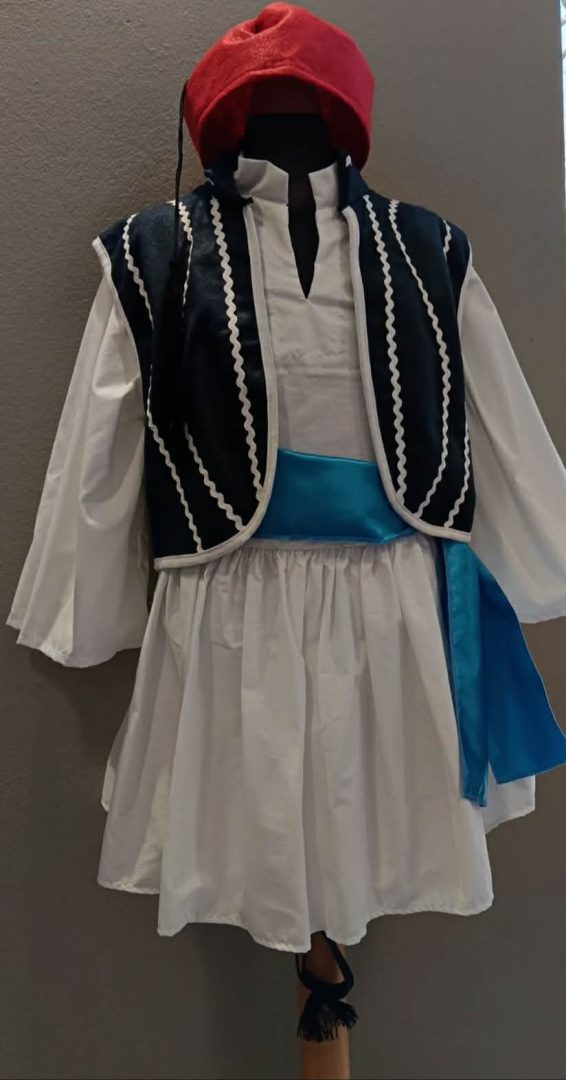 6τμχ.κοκκινο φέσι, γιλέκο μπλε με σηρητια λευκά,λευκή πουκάμισα, φουστανέλα,ζωνάρι ρουά,καλτσοδετες.